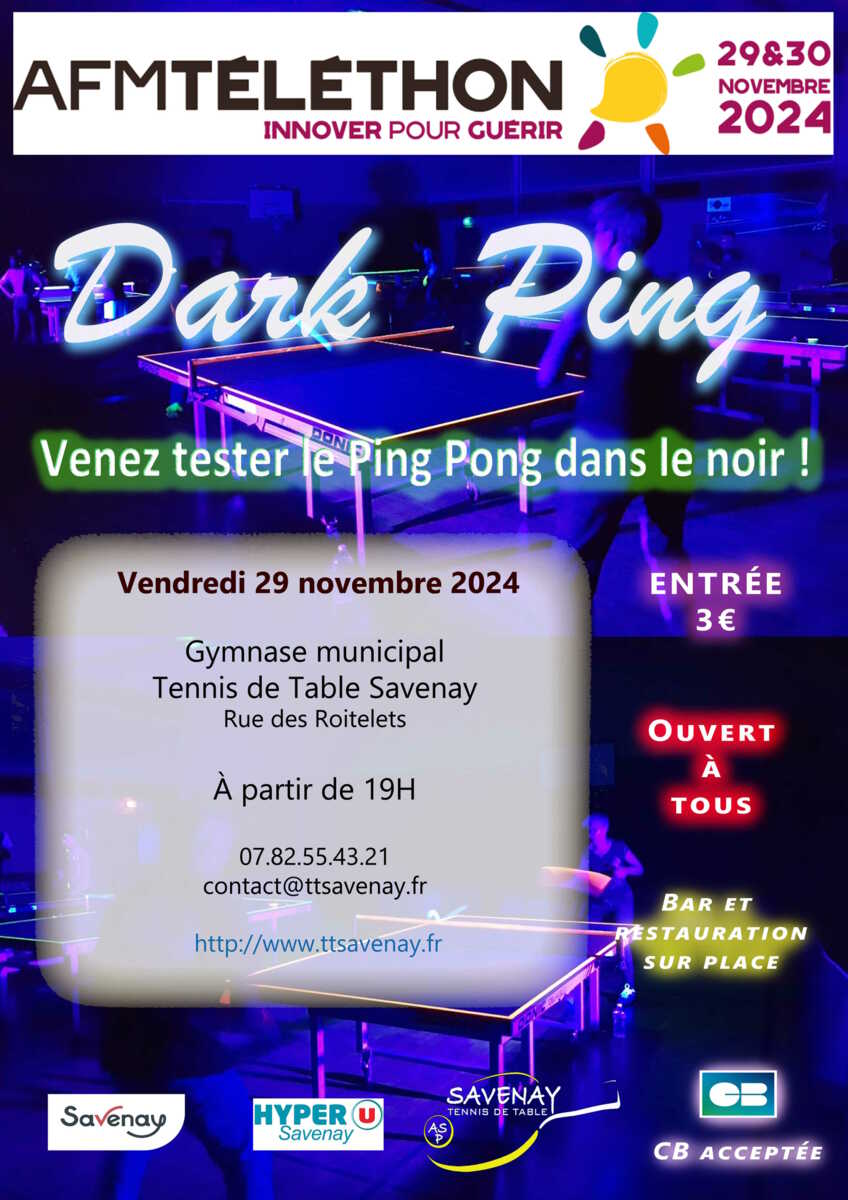 Le Dark Ping traditionnel du club fait son retour ! Comme chaque année, il aura lieu le week-end du Téléthon, le vendredi 29 novembre 2024.